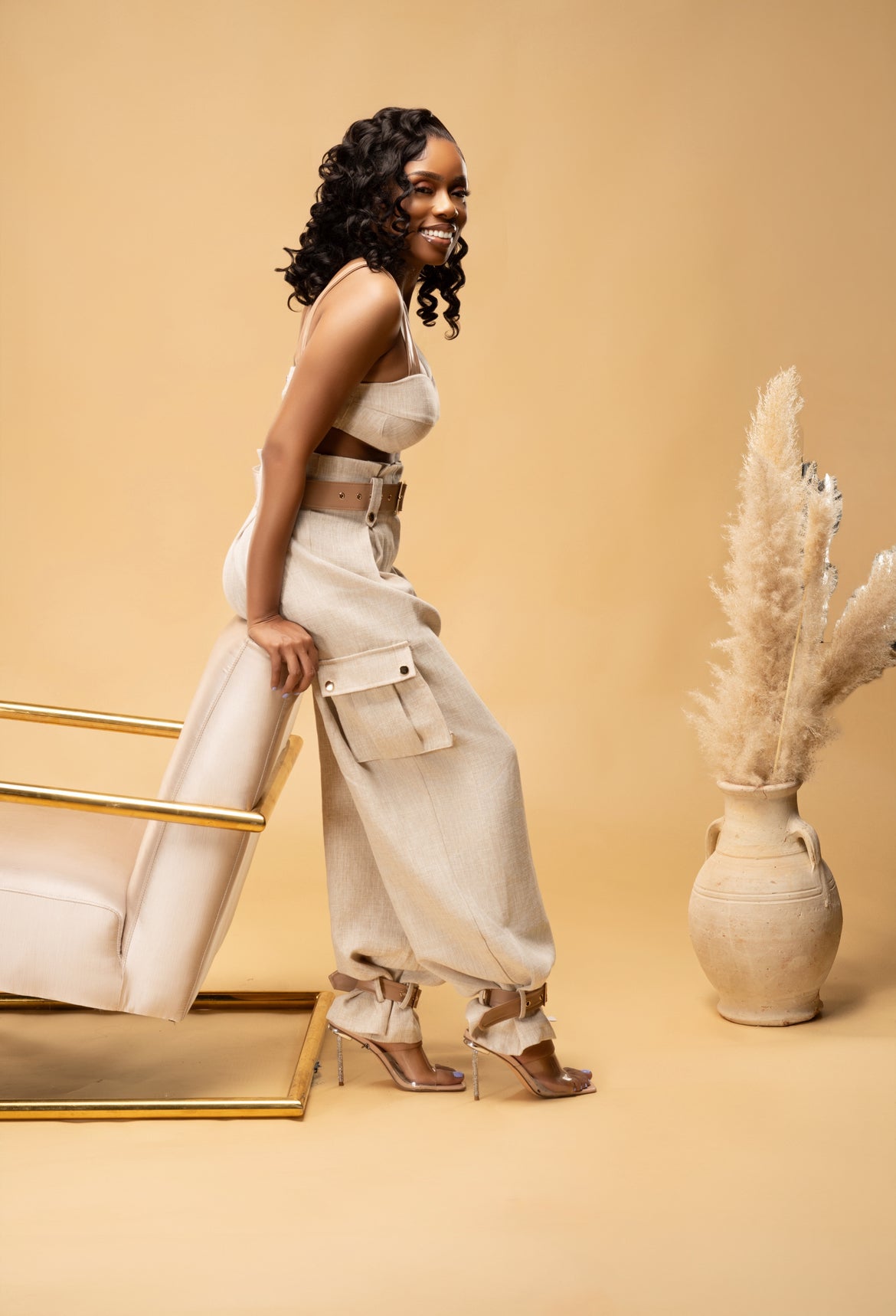 Pants: A polyester-cotton blend lightweight woven crepe fabric, giving structure while still being breathable. The ankle and waist belts are faux leather with gold-tone hardware